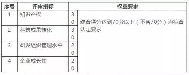 企业创新能力主要从知识产权、科技成果转化能力、研究开发组织管理水平、企业成长性等四项指标进行评价。各级指标均按整数打分,满分为100分,综合得分达到70分以上(不含70分)为符合认定要求。四项指标分值结构详见下表: