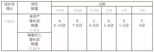 以上两个指标分别对照下表评价档次(ABCDEF)得出分值,两项得分相加计算出企业成长性指标综合得分。